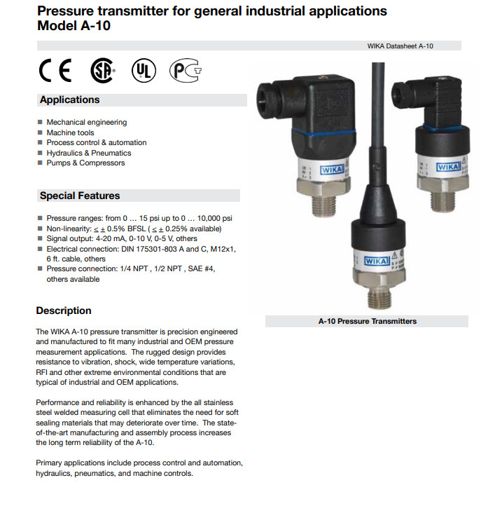: 一般産業用高品質の圧力トランスミッター;モデルS-20;データシートPE 81.61参照 IO-Link付き圧力センサー;モデルA-1200参照データシートPE 81.90 データシートPE 81.60 ∙ 05/2023 Pressure transmitter For general industrial applications Model A-10 Description The field-proven model A-10 pressure transmitter (pressure sensor) is the all-rounder for pressure measurement in industrial environments機材はコンパクトで,幅広い機械設計に組み込める.多くの測定範囲と特別な測定範囲が,普遍的な適用性を有します.優れた品質と実証された技術 私たちの長年の経験と顧客のニーズの正確な知識は,モデルA-10の開発に組み込まれています10年以上に渡って,無数のアプリケーションで証明されてきました.その一貫して高い品質と信頼性の高い機能は,世界中で評価され,内部および外部監査によって定期的に確認されていますこのベストセラーは,ほぼ恒常的な精度で最大1億回の負荷サイクルを容認できます.例外的に大きな種類は,ほぼすべてのアプリケーションをカバーします.■機械工学 ■測定・制御技術 ■水力学・空気工学 ■ポンプ・コンプレッサー ■船舶工学